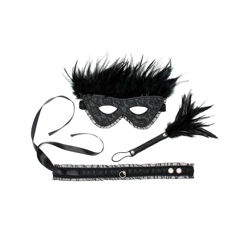 Čutni komplet treh kosov, s katerimi boste presenetili svojega partnerja. Z majhnim perjem za božanje, masko s perjem za dodaten pridih zapeljevanja in ovratnico za bolj perverzen dotik.