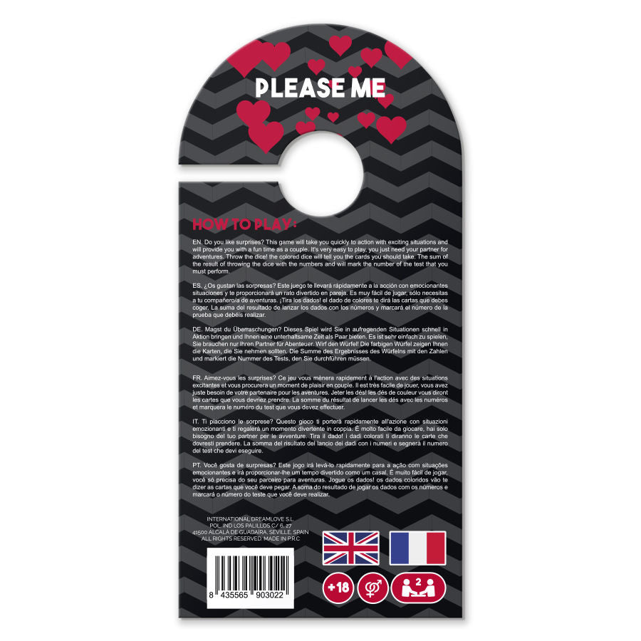 Do you like surprises? This game will take you quickly to action with exciting situations and will provide you with a fun time as a couple. It is very easy to play, you just need your adventure partner. Throw the dice! The colored dice will tell you the cards you should take. The result sum of throwing the dice with the numbers and will mark the number of the test that you must throw.