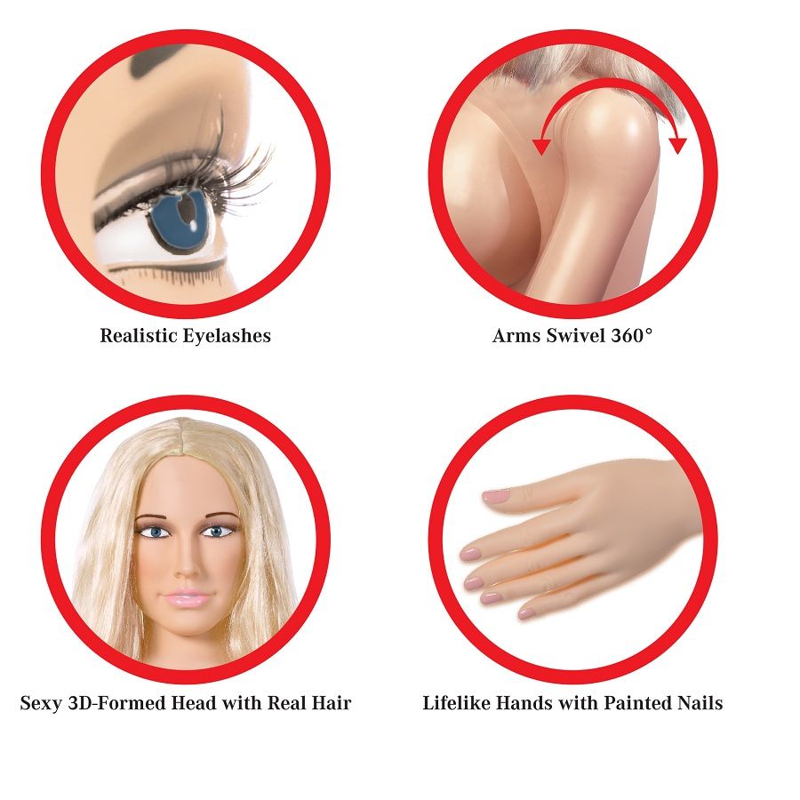 Ta neverjetna napihljiva lutka v naravni velikosti je bila skrbno zasnovana z realističnimi značilnostmi za resnično realistično izkušnjo. Njen privlačni 3-D oblikovani obraz zaključuje razkošna glava z lasmi, ki jih je mogoče umakniti nazaj. Z njenimi prodornimi prsmi lahko uživate v njenih izjemno mehkih in resničnih bradavičkah. Njena vagina in ritka sta tesni in zelo realistični.